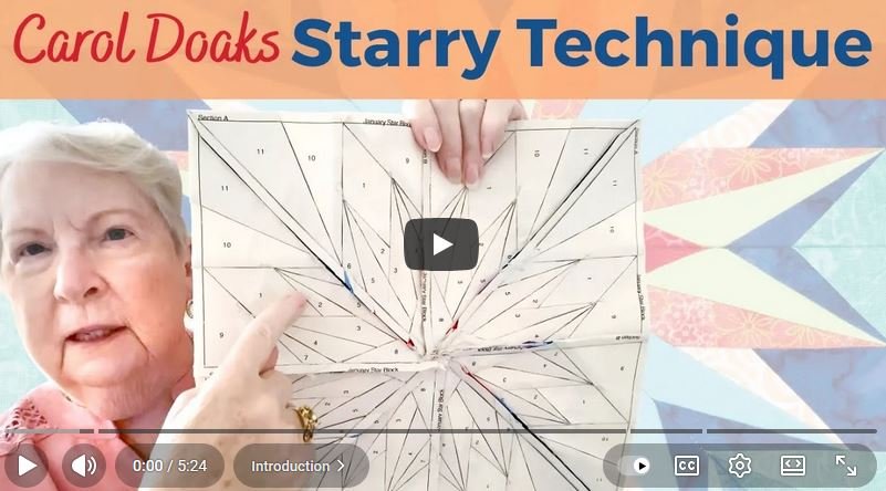 Carol Doak shares her foolproof method for creating perfect points on paper foundation starry blocks from her newest book Carol Doak’s Starry Block of the Month in the video below;